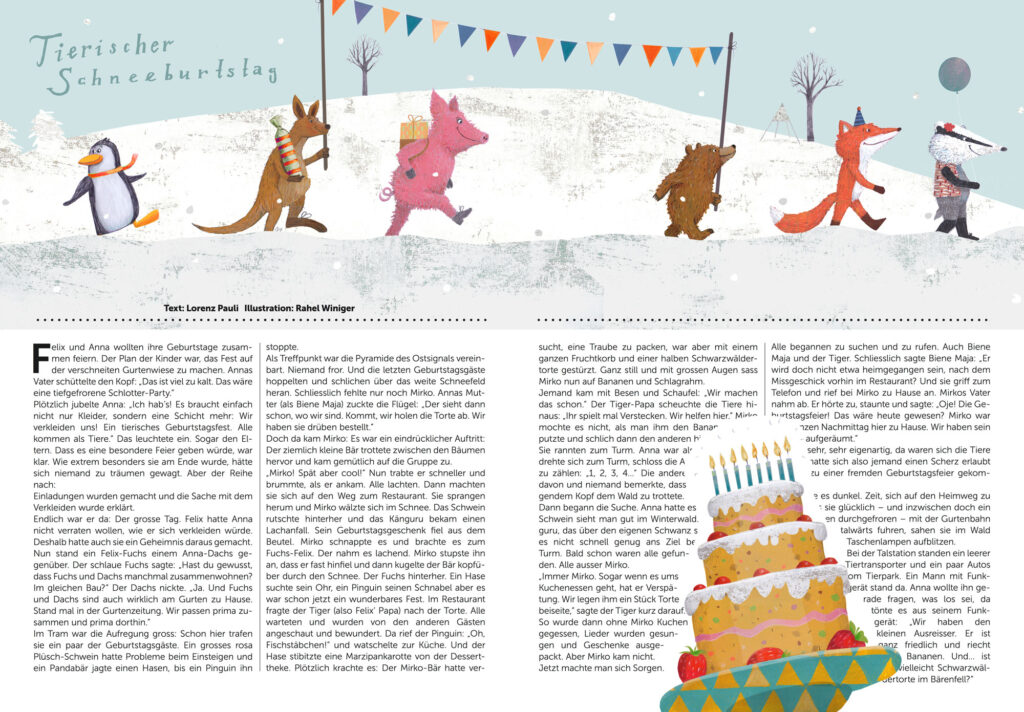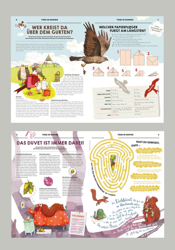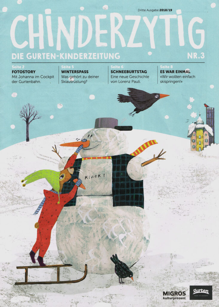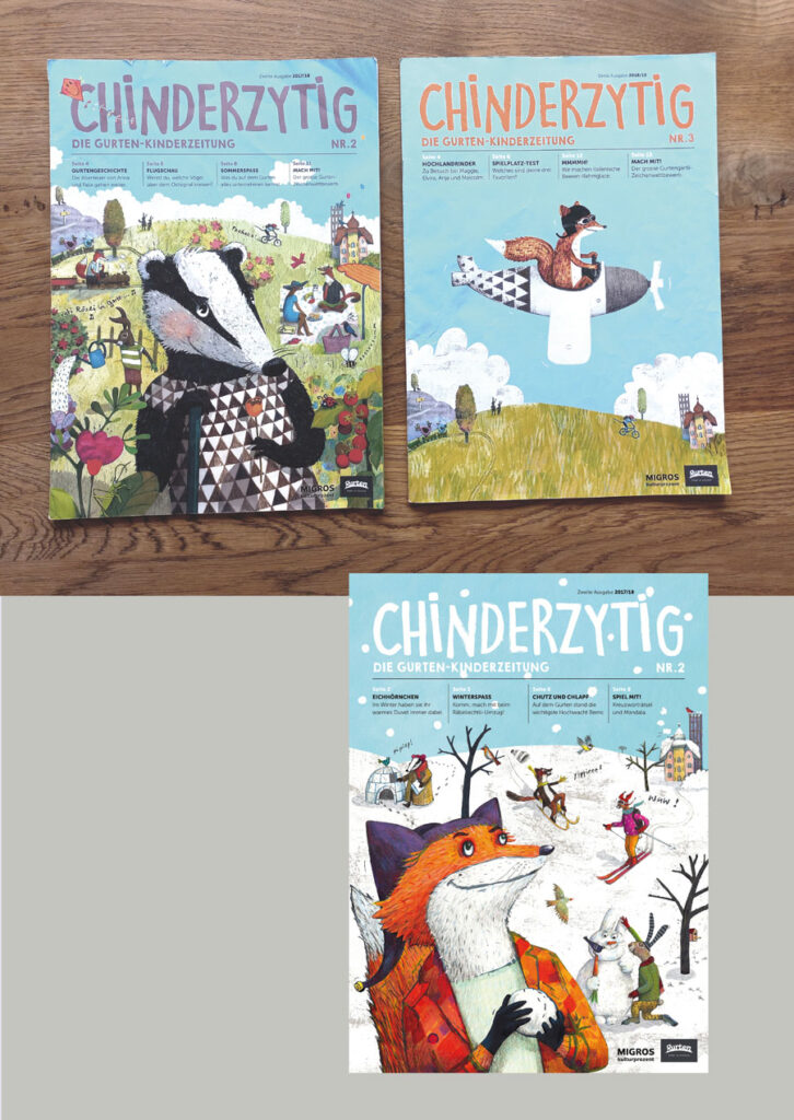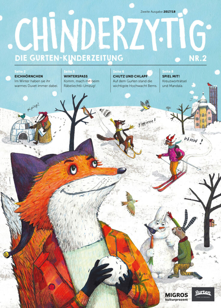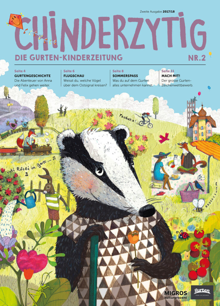 Covergestaltung Gurten Chinderzytig, Geschichten- und Rätselillustrationen, Kinder Menukarte zum Ausmalen für das Restaurant Gurtners, Gurten Park im Grünen Bern / Migros Kulturprozent 2017/18/19